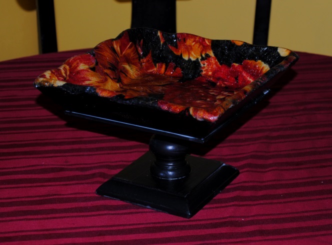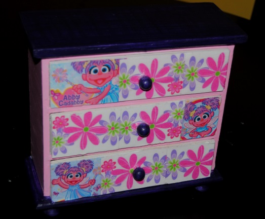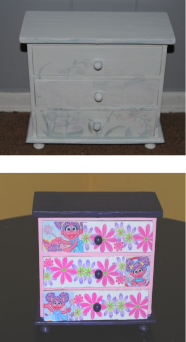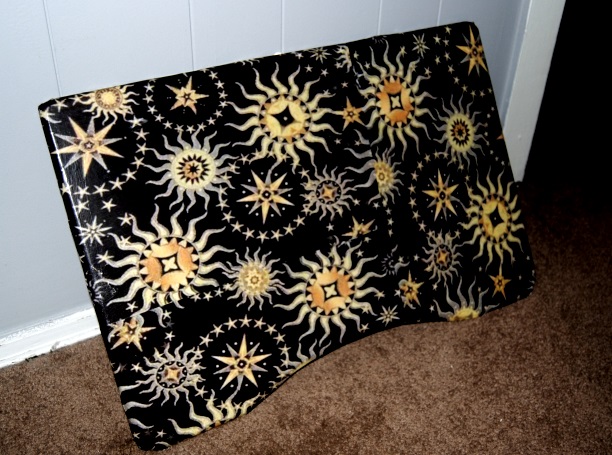 First I tightened the table and cleaned it removing any dust or dirt. Once dry, I primed the areas I planned to paint with a latex primer. I put aside the table to dry. I took the scrapbook paper and cut it into the various sizes, In this case the drawer could not be removed. I could remove the knob, so I pressed the paper up against the outside of the drawer creating a crease in the paper where it would need to be cut. Once the paper was cut I glued it down to the surfaces I wanted to decoupage. I then painted the remaining areas black with black acrylic paint. Once the entire piece was completely dry, I covered the entire piece with Mod Podge Matte finish. I used a medium sized paint brush for the larger areas and a smaller brush for the smaller areas. Once dry, I applied two coats to the smaller painted areas and four coats to the decoupaged areas. The result is what you see here: