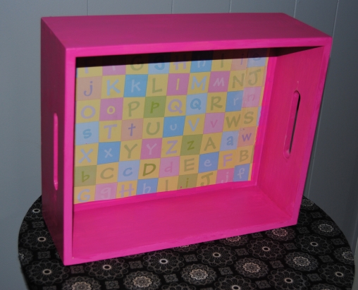 I traced the bottom of the box onto the back of the scrapbook paper cutting it out with scissors. I applied Mod Podge with a foam brush and glued the scrapbook paper to the wood. while it dried, I painted the remainder of the box pink. Once the piece is completely dry, A final coat of Mod Podge is all that is needed to seal the entire piece