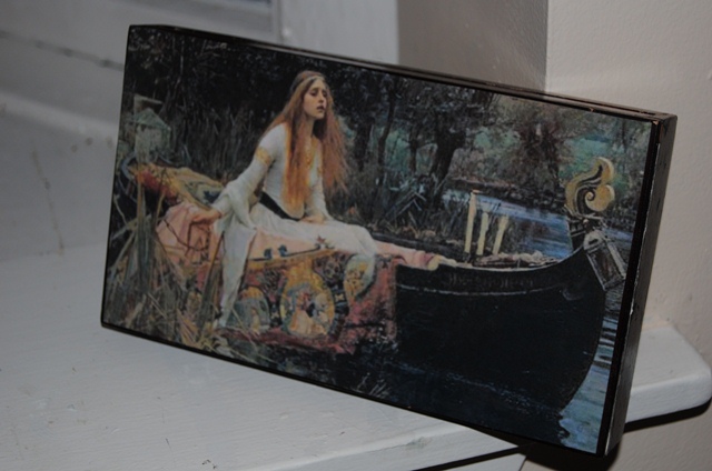 For the lid cover, I chose the John Waterhouse painting The Lady of Shalott. My plan was to line the inside of the box with Ivory Damask scrapbook paper I had on hand. First, I traced the box lid onto the back of the art print. I then traced the bottom of the box, and inside lid onto the back of the scrapbook paper. I then cut them out with scissors. I applied Mod Podge with a foam brush to the lid and carefully adhered the print to the top of the box carefully, smoothing it out with my hands. I allowed the box to dry, and repeated this process on the inside of the box using the scrapbook paper.