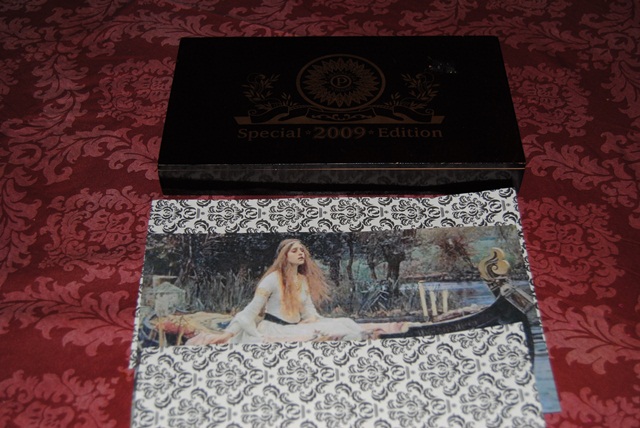 For the lid cover, I chose the John Waterhouse painting The Lady of Shalott. My plan was to line the inside of the box with Ivory Damask scrapbook paper I had on hand. First, I traced the box lid onto the back of the art print. I then traced the bottom of the box, and inside lid onto the back of the scrapbook paper. I then cut them out with scissors. I applied Mod Podge with a foam brush to the lid and carefully adhered the print to the top of the box carefully, smoothing it out with my hands. I allowed the box to dry, and repeated this process on the inside of the box using the scrapbook paper.