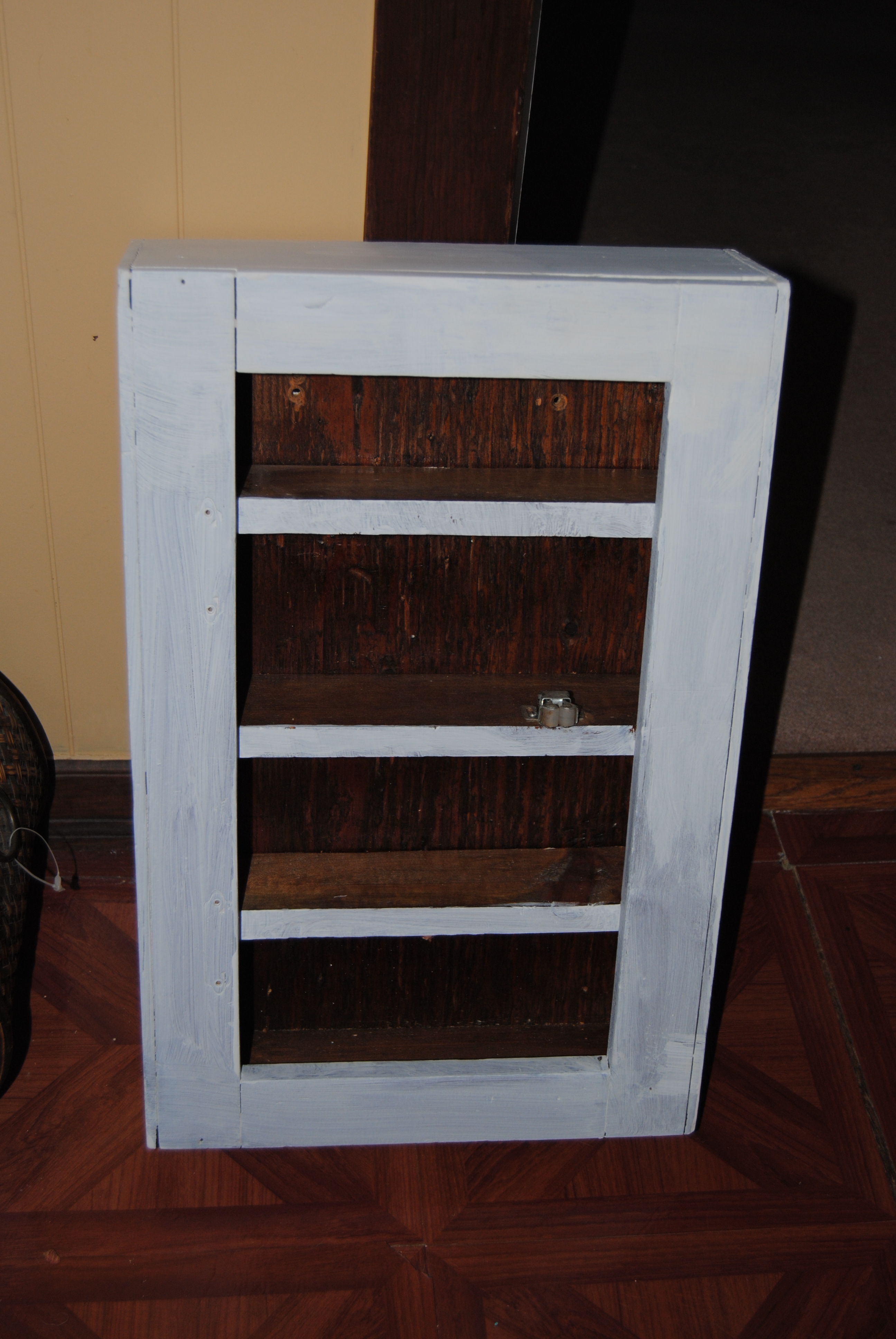 I used a scraper, to remove the access glue front the door and cleaned the cabinet with a wet wipe. I removed the knob and door and set aside. The cabinet was heavily lacquered so I used a white latex sealer to prime the cabinet before getting started.