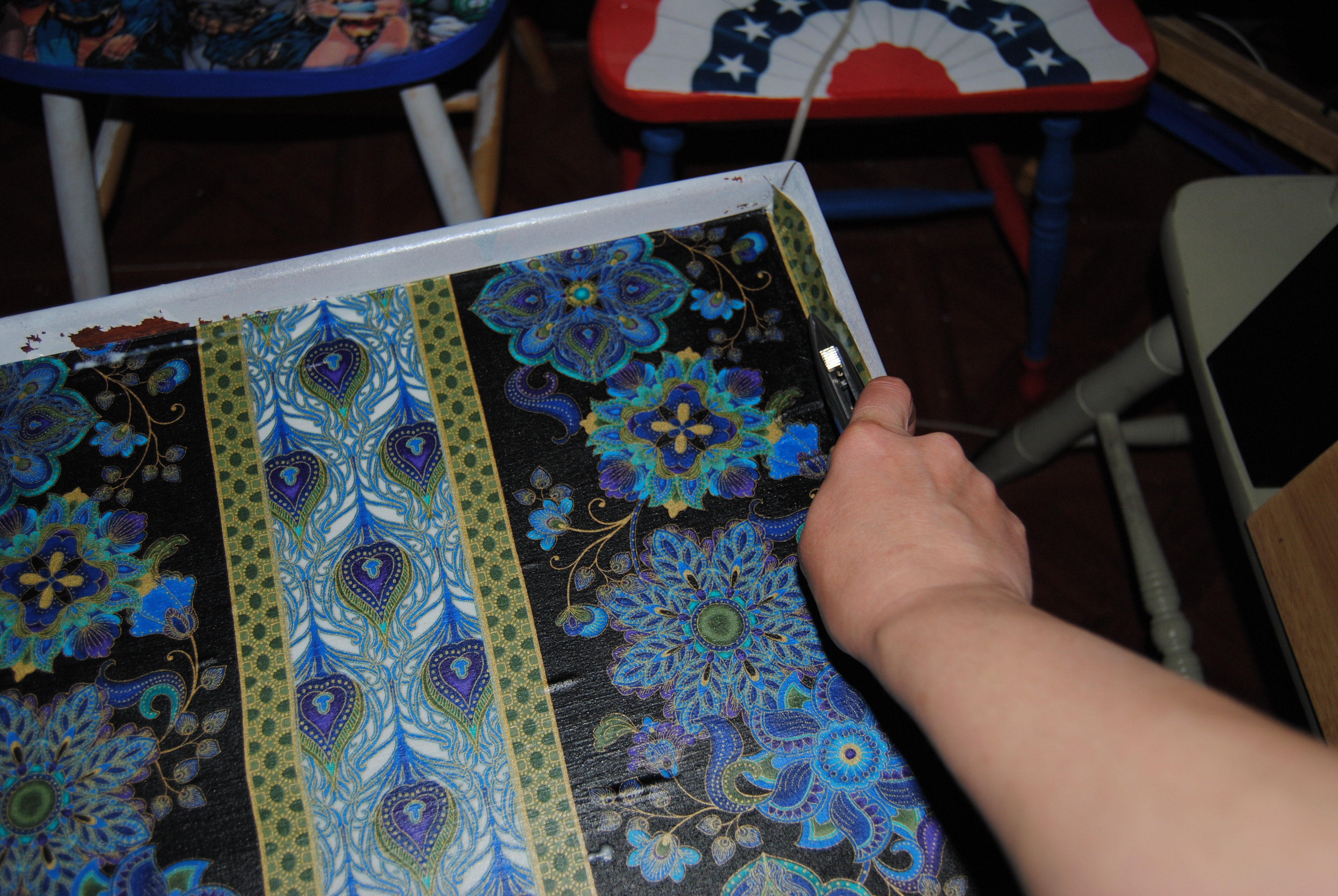 Once dry I brought it back inside the house to the craft room. I flipped the table over tracing the table on the back of the fabric with a black fine tipped marker twice, once for the top surface and once for the middle shelf. I cut the fabric with scissors. I applied the Mod Podge on both shelves and carefully place the fabric down, smoothing it out with my hands, I applied Mod Podge over top and allowed it to dry, Any excess fabric, I trimmed with a box cutter knife. I also applied extra Mod Podge to the corners where the fabric meets the table .