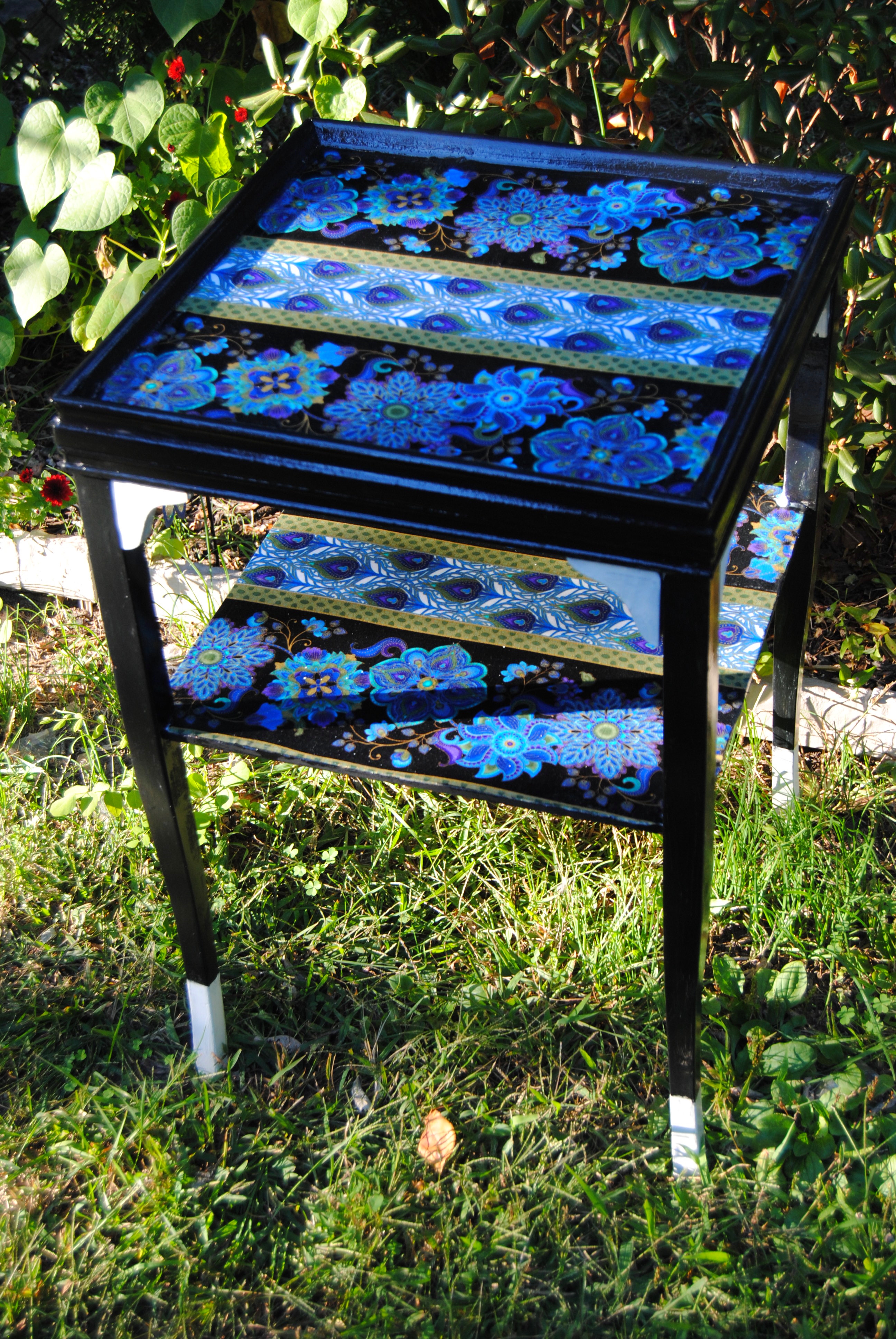 It sat for a while collecting dust. I wanted to do something really special with it, but my vision was stifled. I used it to work on projects, but this table certainly deserved a more dignified life, A trip to Jo Ann Fabrics changed everything. They have a new super store less than a mile from home and it stocks row upon row of fabric. I came across a beautiful peacock inspired fabric. It made me think of the side table and I decided to buy about a yard of it. I liked it so much I wanted to have extra to use in a future project or two. It felt nice to treat myself a little, plus I had a 40% off coupon!