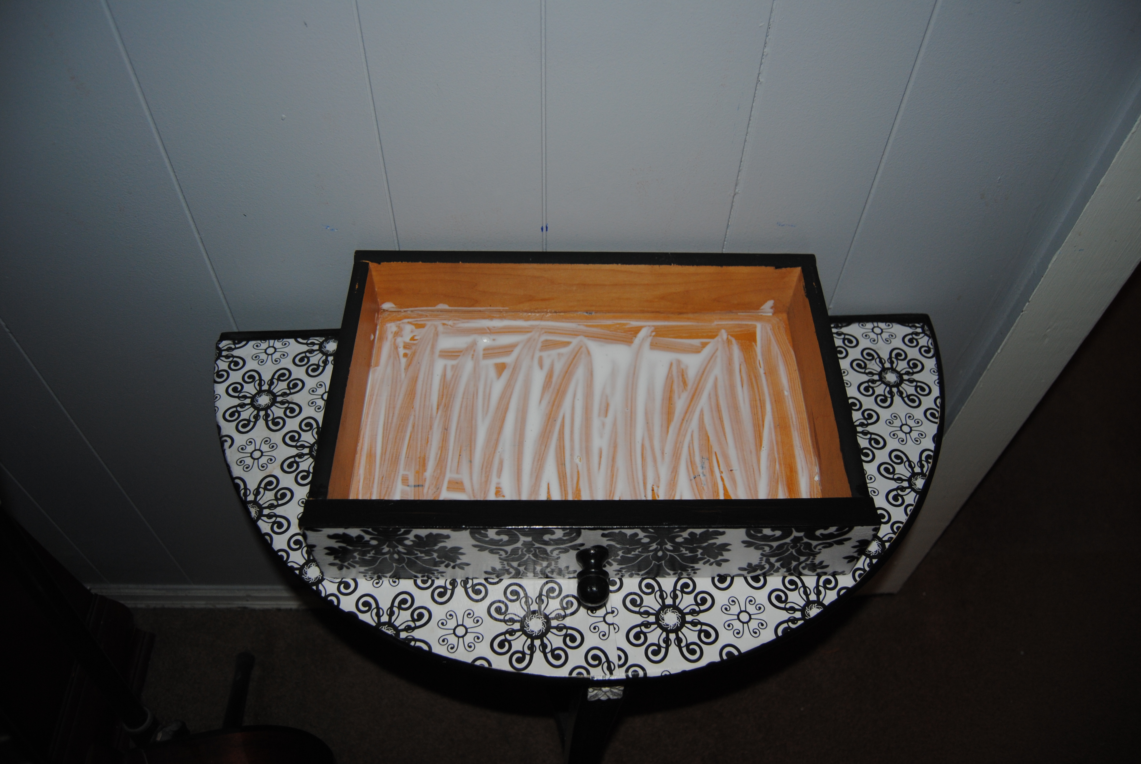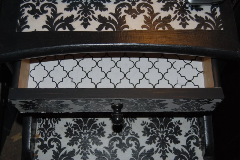 Now, the challenge begins… I have to come up with design ideas for these wonderful pieces that do them the justice they deserve. Meanwhile, all of this did make me think about my own much-needed spring cleaning and looking for items to reuse and repurpose that I already have instead of buying additional pieces. A project I did fairly recently incorporates that idea. As crafters we accumulate various supplies some of which we never use. I have a collection of scrapbook paper that fits this profile. The good news is there is nothing better than scrapbook paper when it comes to decoupage. It can be used for so many projects not just it’s obvious purpose. One of my very first projects involved a pair of upcycled bedroom tables. It has been almost a year since completing these tables and they have held up fantastically well. When I restyled them, I left the inside of the drawers undone and decided this would be a great way to use up some of that scrapbook paper.