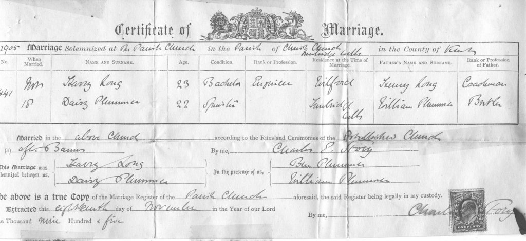 There are very few items around our house that I would call “priceless” As a family historian there is nothing more precious than old family pictures, and documents. One of the most precious documents is my great-grandfather and great grandmother’s wedding certificate and photo album. My great-grandparents married in The Christ Church in Tunbridge Wells in November of 1905. This document was passed down in my family and offered many clues that helped me get started with my family research. It listed the names of my Great, Great Grandfather’s and their occupations. Henry Long a Coachman and William Plummer a butler.