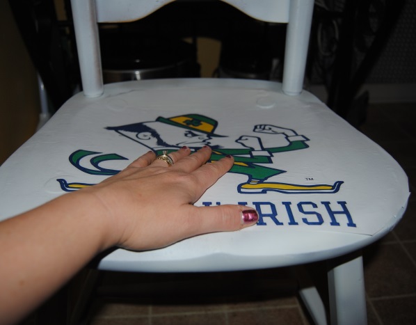 It seemed the perfect project chair, and with that the Fighting Irish Notre Dame chair, was born. If you have followed my blog, you know I have a special place in my crafty heart for chairs. I am drawn to functional pieces of art and to me a chair embodies both these elements nicely. I printed out the college decal of choice on my printer. I then cleaned and prepped the chair with a white spray on primer.