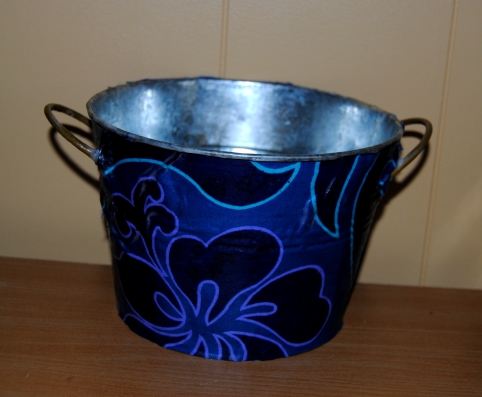 I decided to try to decoupage this bucket. I saw some examples online and liked the look. I realize some may prefer the bucket without decoupage, but since I was making it for a craft room, I wanted to make it fun and experiment. It also gave me the opportunity to use Mod Podge for the first time on metal. I had this great old bed sheet, colorful and fun. I thought it would be perfect for this bucket and would contrast nicely with the silver metal.