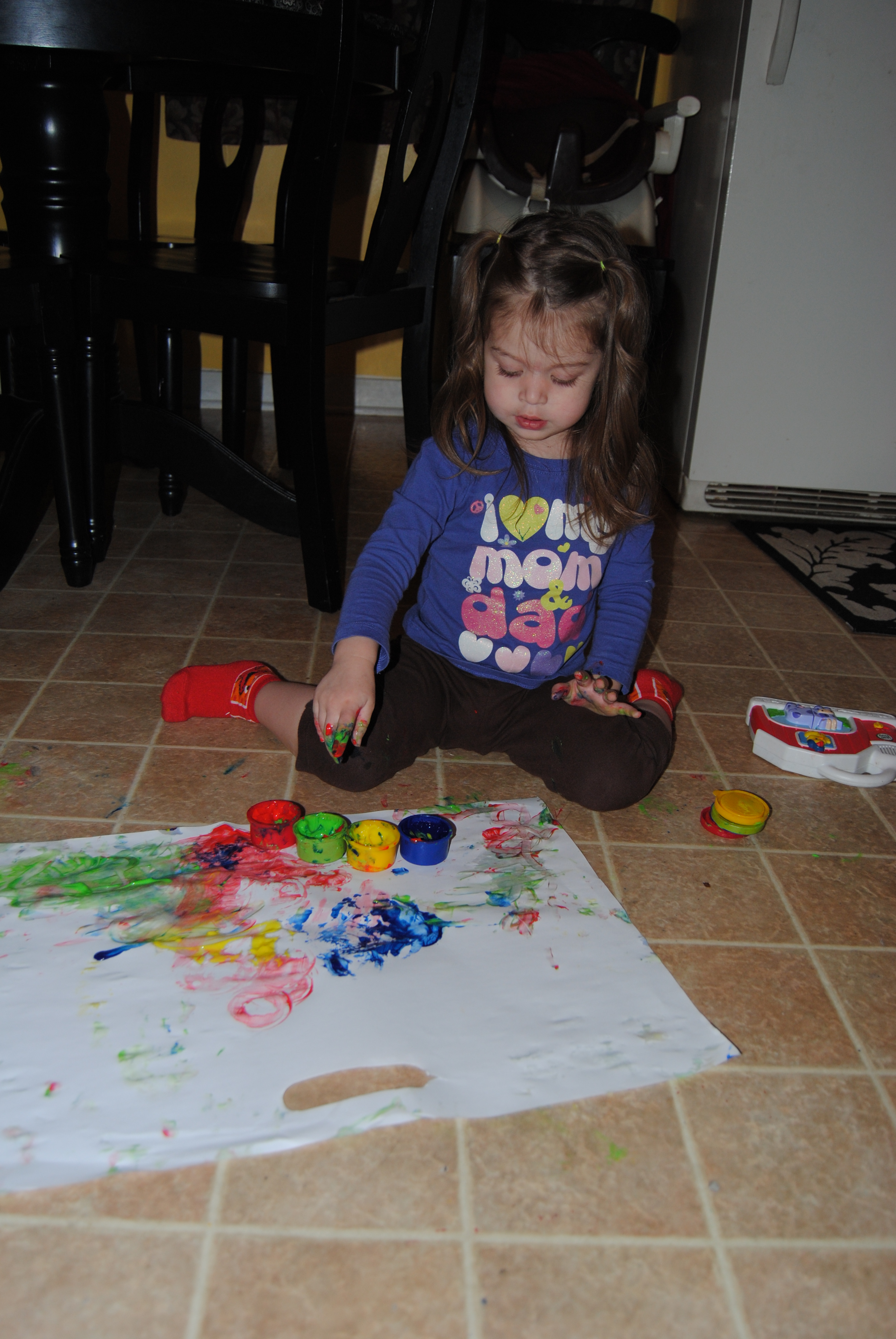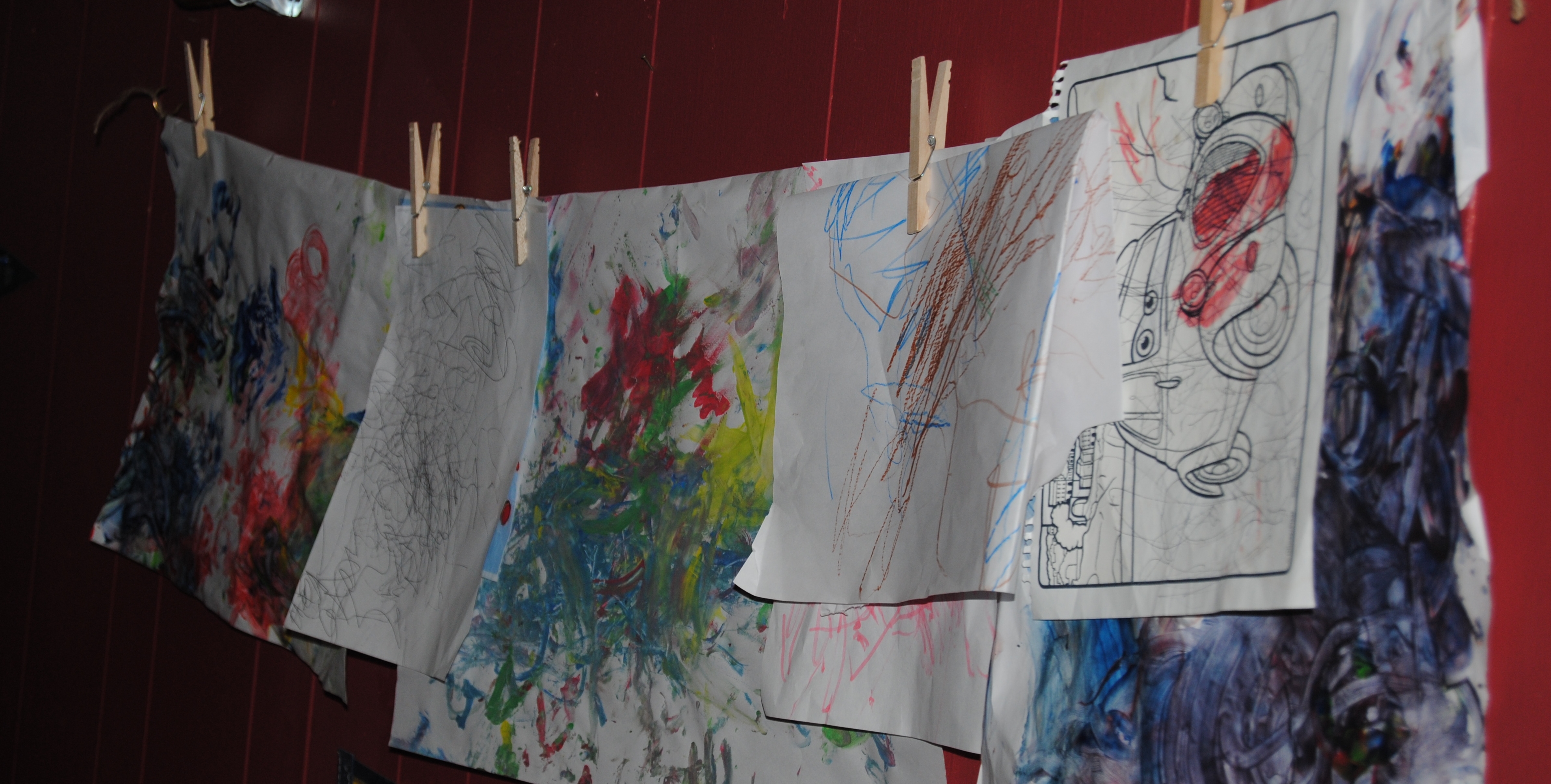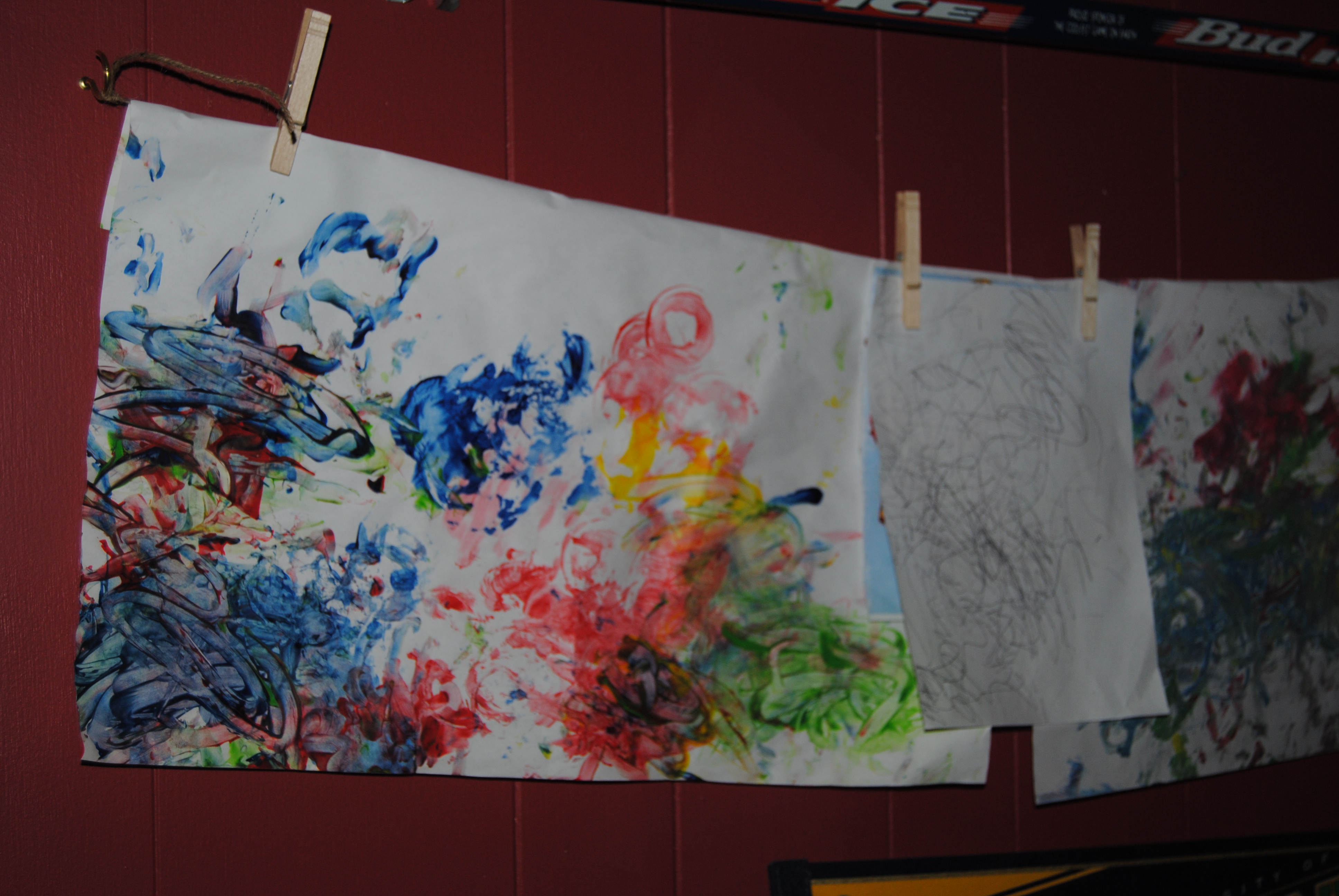 Two of the toddler apprentice’s favorite activities are drawing and painting. As a proud mom, I consider all of her drawings mini masterpieces. I like to keep and display her artwork, but the refrigerator door was becoming too crowded. I decided to display them on the playroom wall via a “mini” clothes line. (minus the clothes of course!)