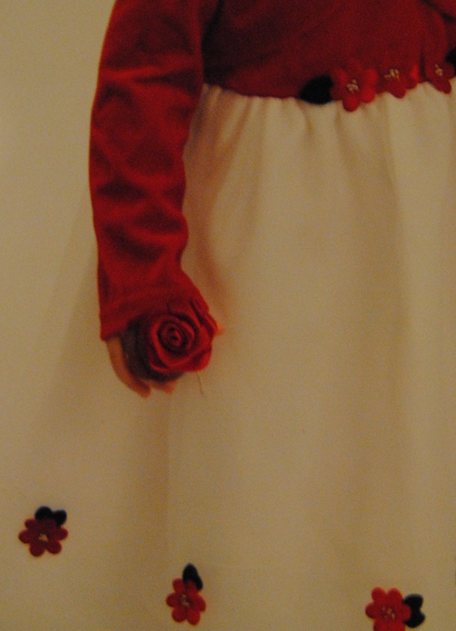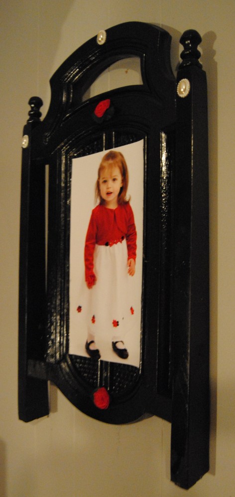 The next day, I chose a large photo from one of my daughter’s previous Picture People photo sessions. I measured the area and trimmed the photograph to sit inside the middle of the chair back. I used a hot glue gun to adhere the photo to the wood. I had a few craft jewels and roses that I added to the chair back to make it “pop” I originally glued a large rose to the bottom of the chair back, but decided to remove it later as you will see in the photos below. One of the smaller roses, I carefully glued to her hand in the photo, It creates an illusion that she is actually holding a rose in the photo. I think it gives the photo a bit of an extra dimension. A nice little “touch” to the project.