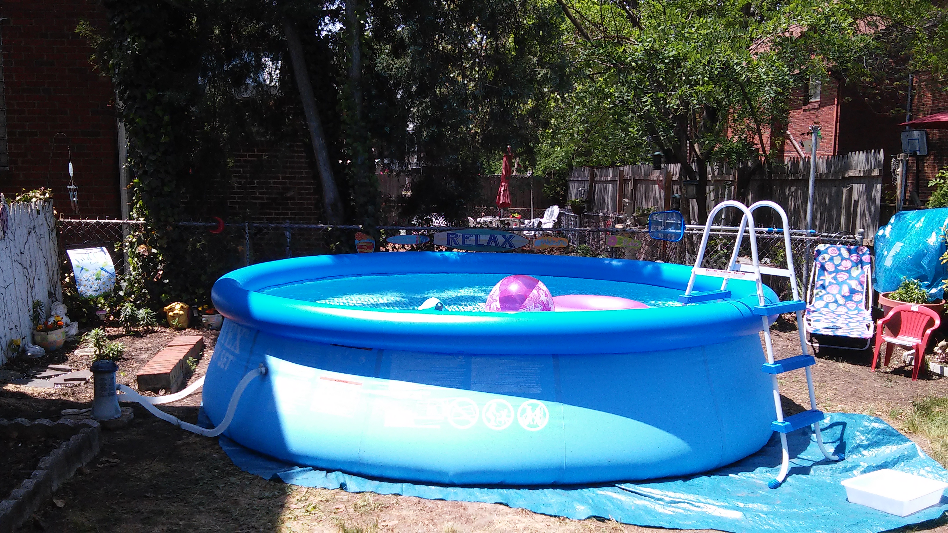 We inflated the ring with a pump, and from the inside smoothed out the lining. It took all day to fill. The next day, we hooked up the filter, placed chlorine tabs in the floater, and assembled the ladder. The water was very cold, so I hopped in to the pool for a test run. For the most part everything went great and the set up was easy. I was disappointed to find some parts in the lining that were not as smooth as we had wanted. I can’t stress enough the importance of making sure the ground is clear of any debris and level. Even after all our careful work, what seemed smooth at the surface was not always the case. Once the weight of the water pressed the ground flat, some rocks and roots underground seemed to appear out of nowhere through the lining. That being said the only way to remedy this would be to drain the pool and remove the debris from the area to smooth it out. Until it is necessary to do so, we are going to take our chances. I would feel guilty wasting all that water! Luckily the pool came with plenty of patches if needed.