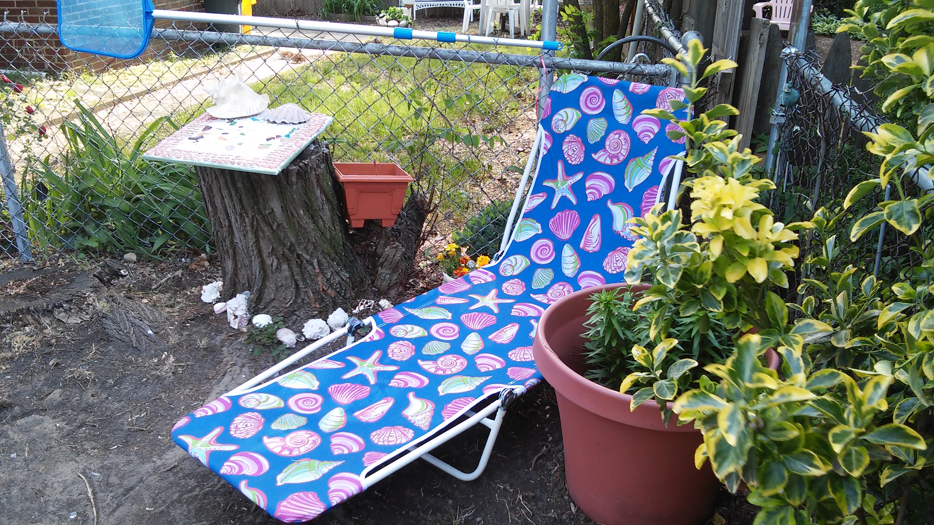 I struggled with what to do with this stump for some time. This weekend that changed. I decided to make it a fun project for my daughter and I to do together. I had an old broken wooden TV tray. I removed the table top from the legs and screwed it on to the tree stump surface. My neighbor had given me some decorative, shells, glass pebbles and decorative rock. I thought it would be fun for us to create a mosaic table top for it. I used some old tile grout and glue in one and spread it onto the table surface evenly. The toddler apprentice and I then applied the rocks and glass pebbles. We wiped off any excess grout and allowed it to dry overnight. I used the unused legs of the TV tray as a garden trellis, another great re-purpose! My goal was to use as much of the table as possible. Mission accomplished!