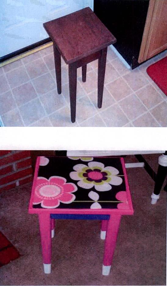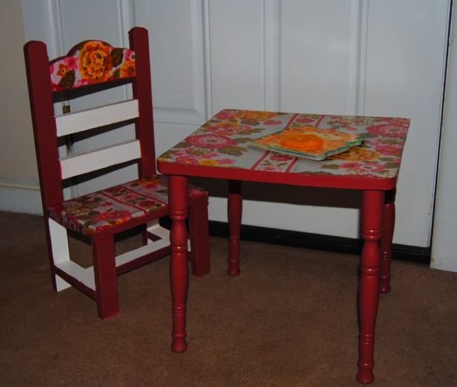 Once the glue was dry, I hand painted the table with pink, purple and white acrylic paint. This was turning out to be a much different table then I had originally anticipated. After a few more coats of paint, I added generous amounts of Mod Podge to the table top to seal the fabric. I repeated this process three times allowing it to dry between coats. I also applied Mod Podge to the painted surfaces, to seal the entire piece.