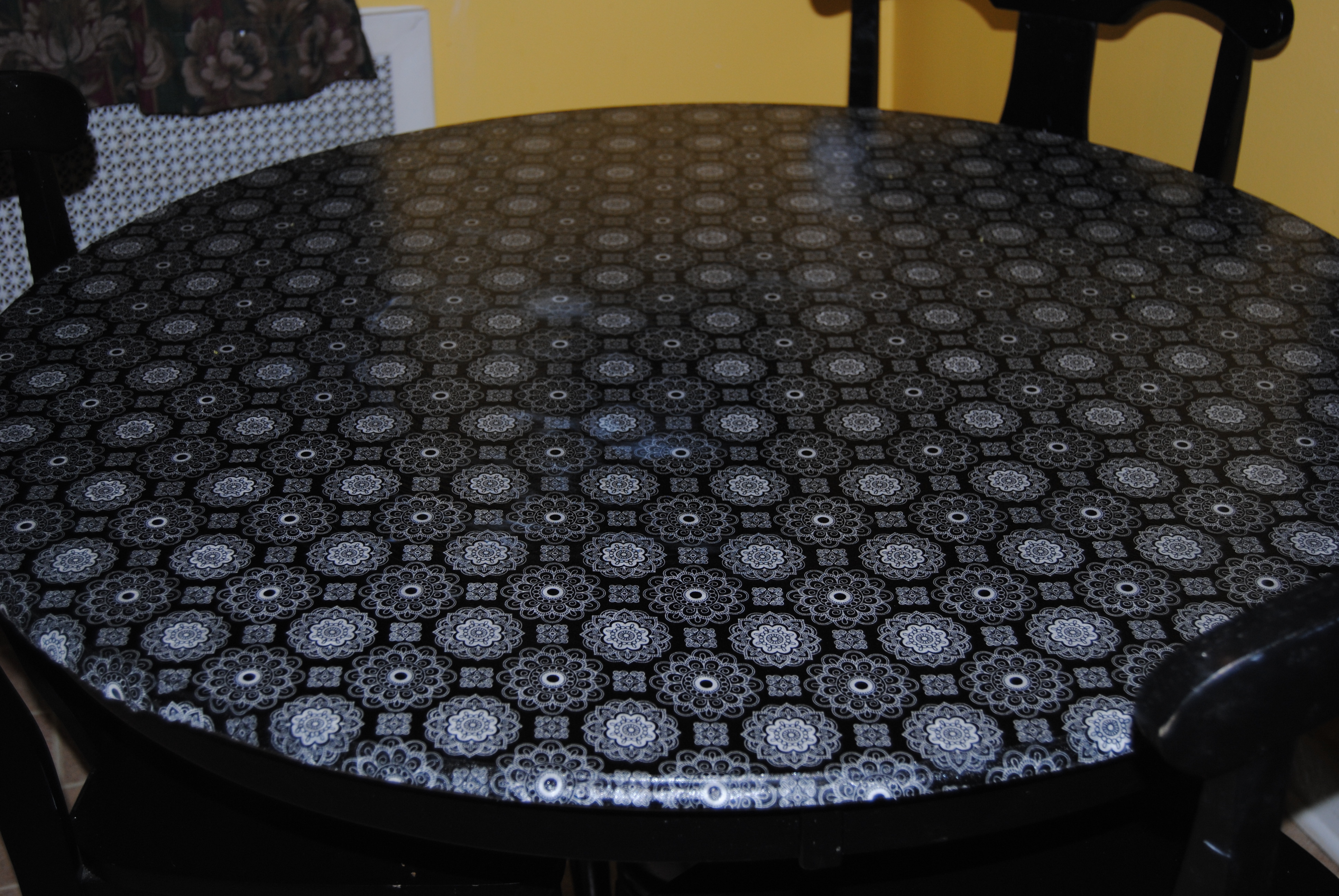 I cut the fabric and measured out a large enough piece to cover the top of the table. I applied a generous amount of Mod Podge to the table surface. The general rule is the thicker the material the more Mod Podge you will need to use to achieve the desired effect.