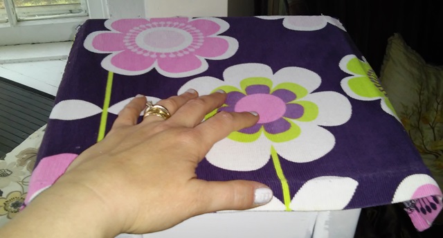 This is a side table with a lot of flower power and 1960’s appeal. I am hoping this table makes some little girl very happy! It will be just one of the items for sale this weekend. I also loved working with corduroy! Because of the thickness of the fabric, I was unsure as to how it would turn out and was more than pleased with the end result!